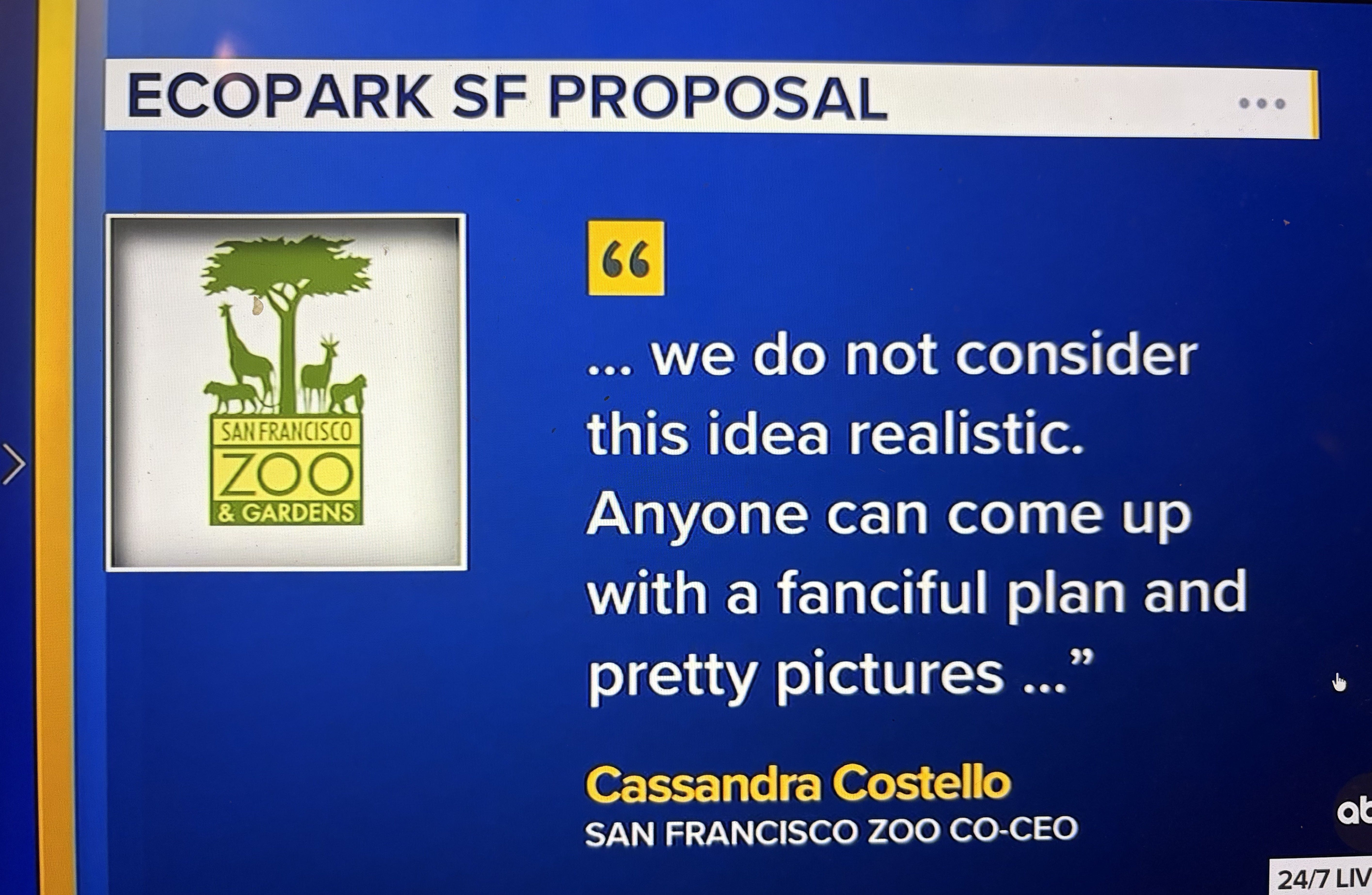 In response to the EcoPark SF proposal, San Francisco Zoo leadership issued the following statement to ABC7 News today: