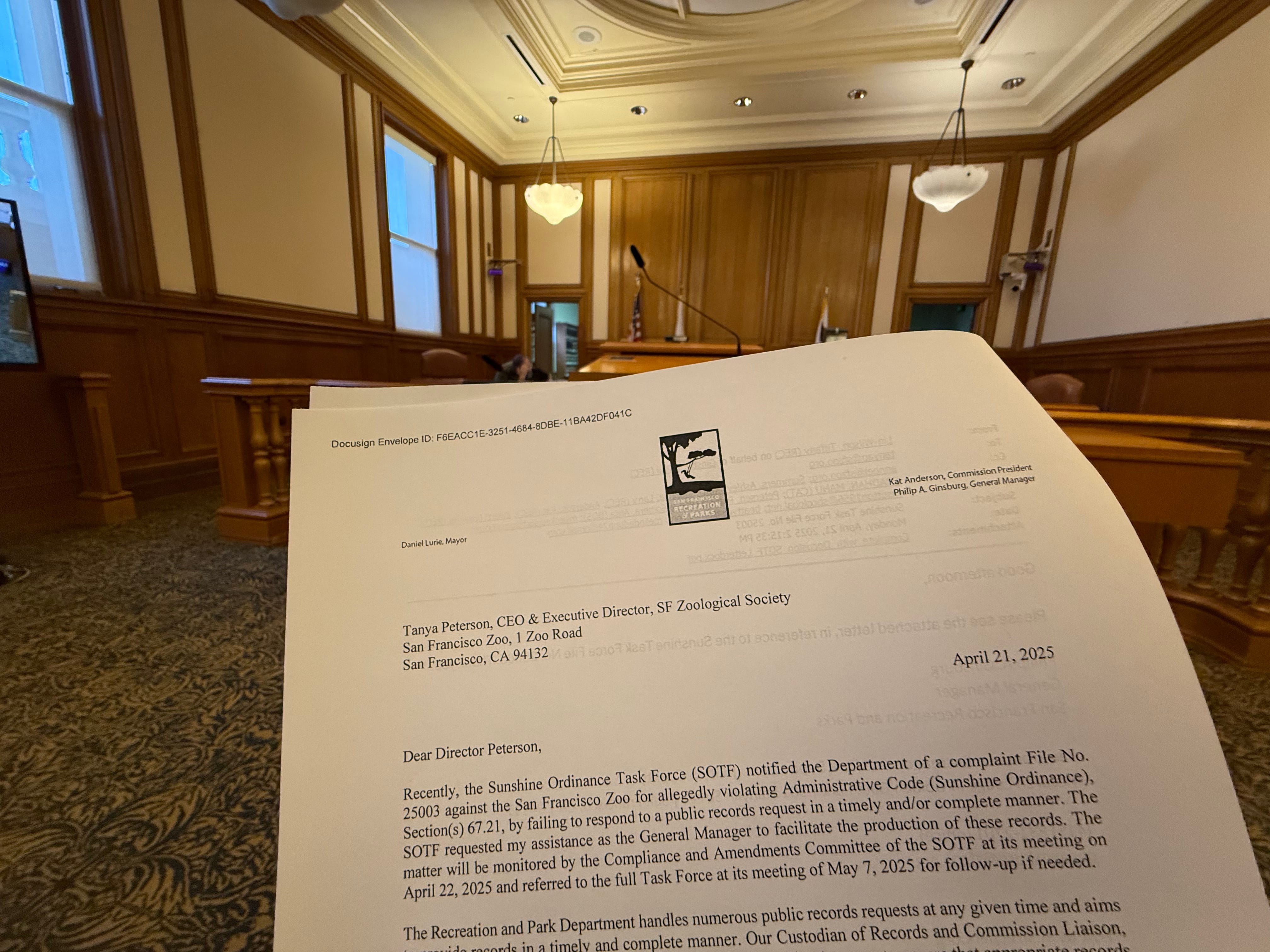 On April 21, 2025, Philip Ginsburg, General Manager of the San Francisco Recreation and Park Department, issued a formal letter to Tanya Peterson, CEO of the San Francisco Zoological Society, instructing her to comply with public records laws as required under the Zoo’s lease agreement with the City.